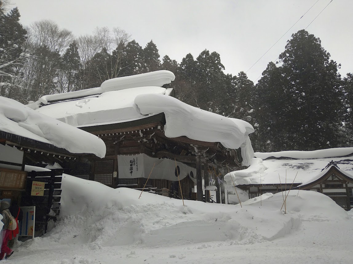 本殿屋根に厚く降り積もる雪が、重たそうで心配になるくらい。