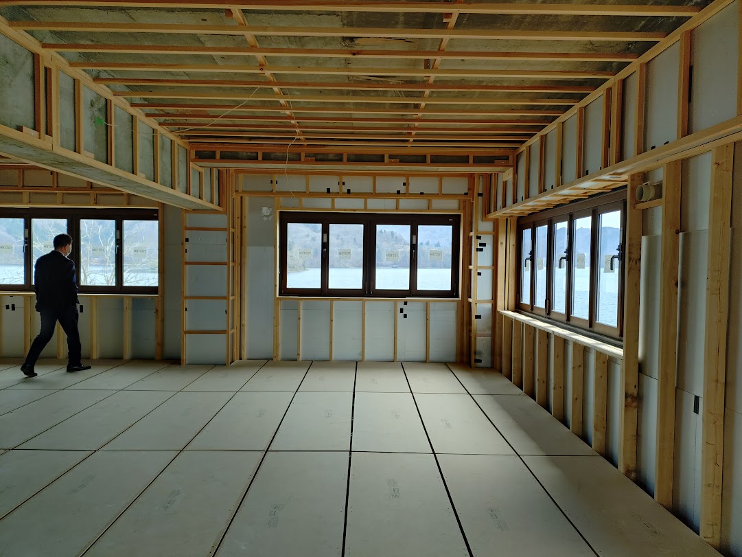 野尻湖湖畔に建つRC造の3Fで、窓から釣り糸を垂らせば釣りが出来そうなくらい、部屋が湖に近接しています。