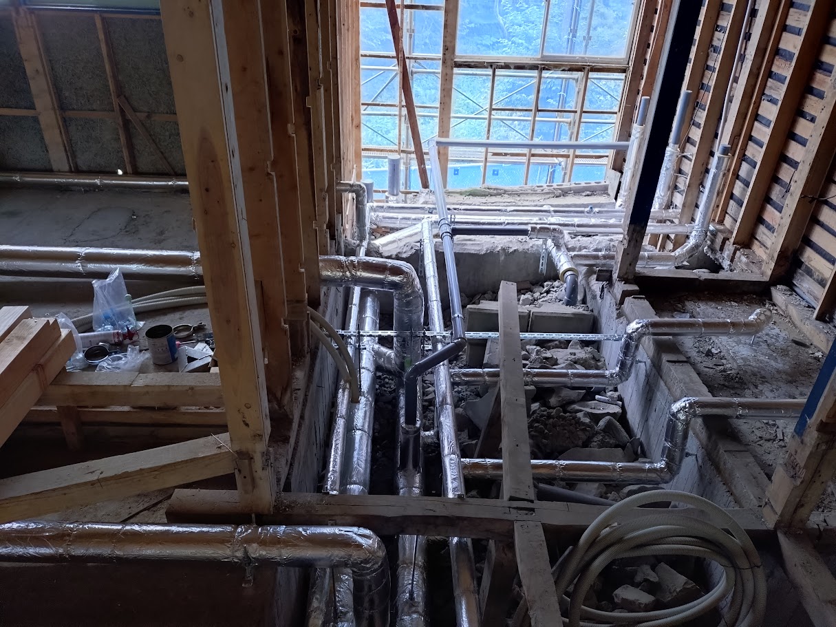 設備配管類は、ほぼ全て更新となる上に、レイアウトも変更になるため、どこにどんな配管を通すか立体的に隙間を見つけてはルートを検討しています。