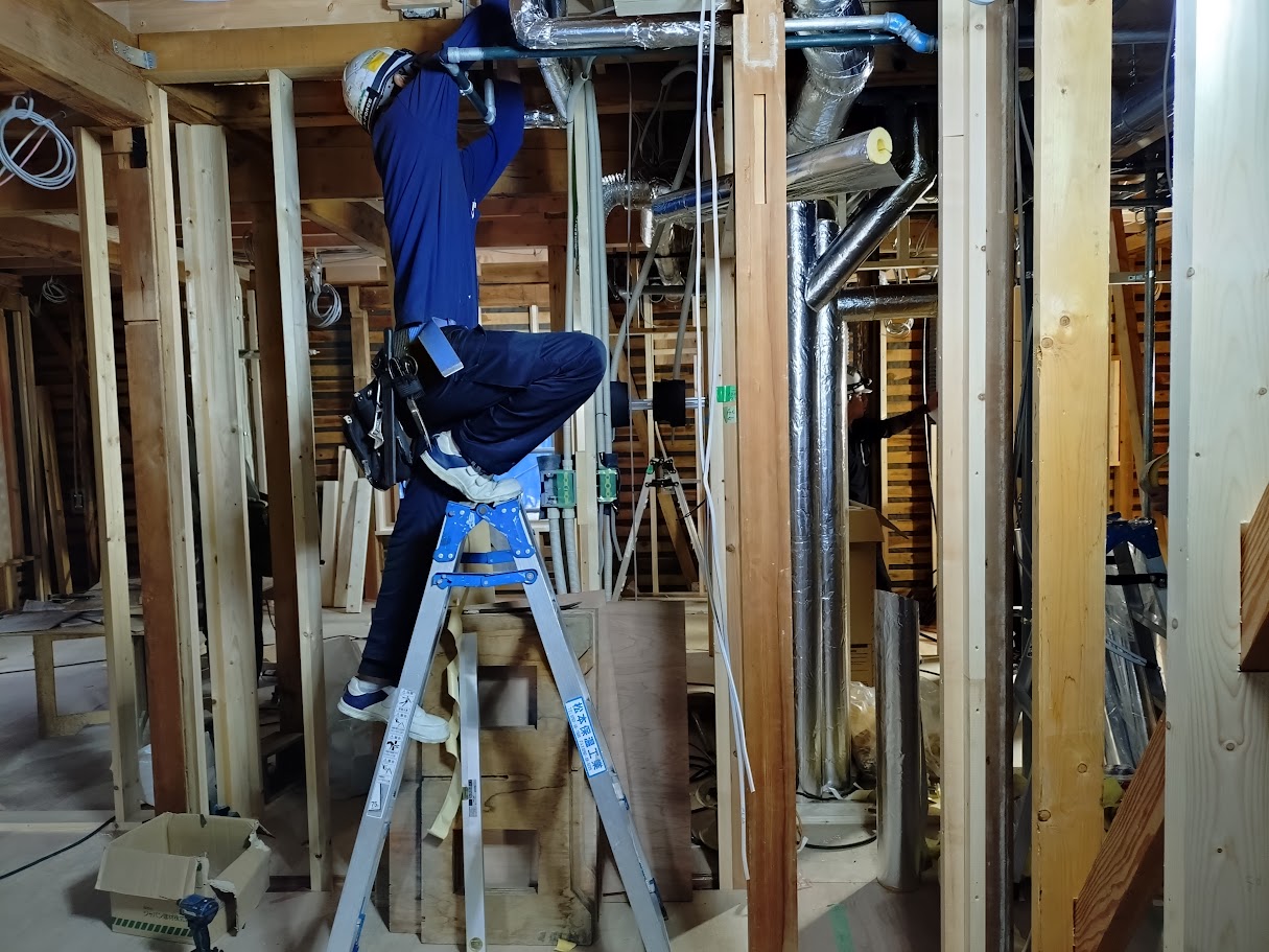 戸隠神社社宅改装工事は、来週からの断熱材吹込み工事前に、通気止めや設備配管類の確認を行いました。