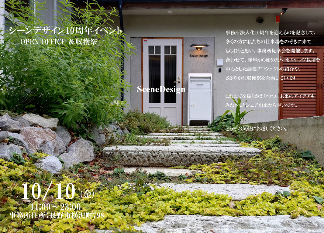2025/09/13 10周年イベント 事務所法人化10周年を迎えるのを記念して、多くの方に私たちの仕事場をのぞきに来てもらおうと思い、事務所見学会を開催します。 合わせて、昨年から始めたヘーゼルナッツ栽培を中心とした農業プロジェクトの紹介や、ささやかな収穫祭を企画しています。 これまでを振りかえりつつ、未来のアイデアもみなさまとシェア出来たら幸いです。 どうぞお気軽にお越しください。 2025 Event ブログ一覧へ戻る All
