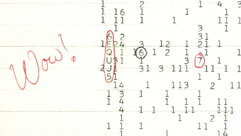 1977年8月15日にオハイオ州立大学のビックイヤー電波望遠鏡によって検出された、1420メガヘルツという周波数の強力かつ狭帯域の電波シグナル。