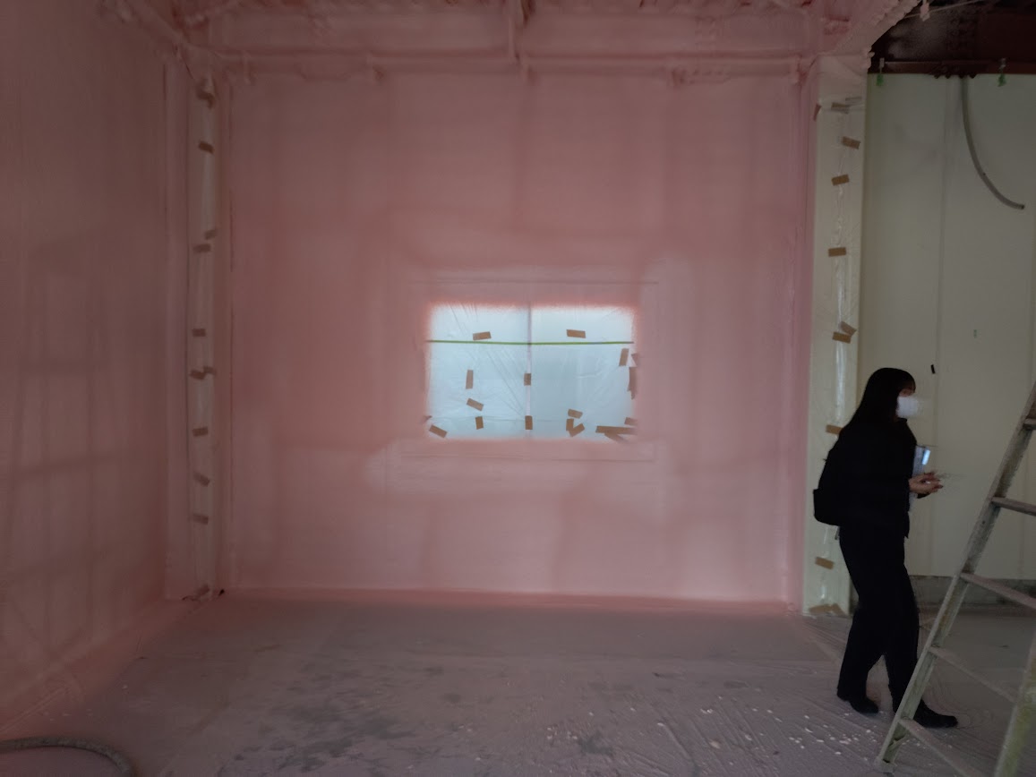 今日は、内部の発泡ウレタン吹付工事の施工中でした。