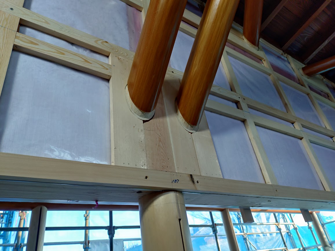印籠納めとは、部材同士を凹凸に加工して嵌め込み、しっかりと固定する接合方法なのですが、今回の様に、丸太でしかも斜めに取りついている部材の納めとしては、難易度maxです。