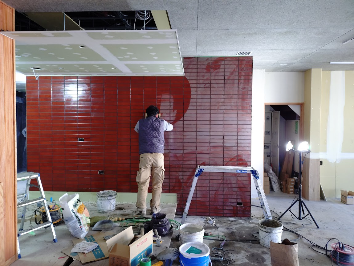 カフェのメインのタイル壁は、予定していたタイルの在庫が無くなる等して、すったもんだしましたが、結果かっこよくなったと思います。