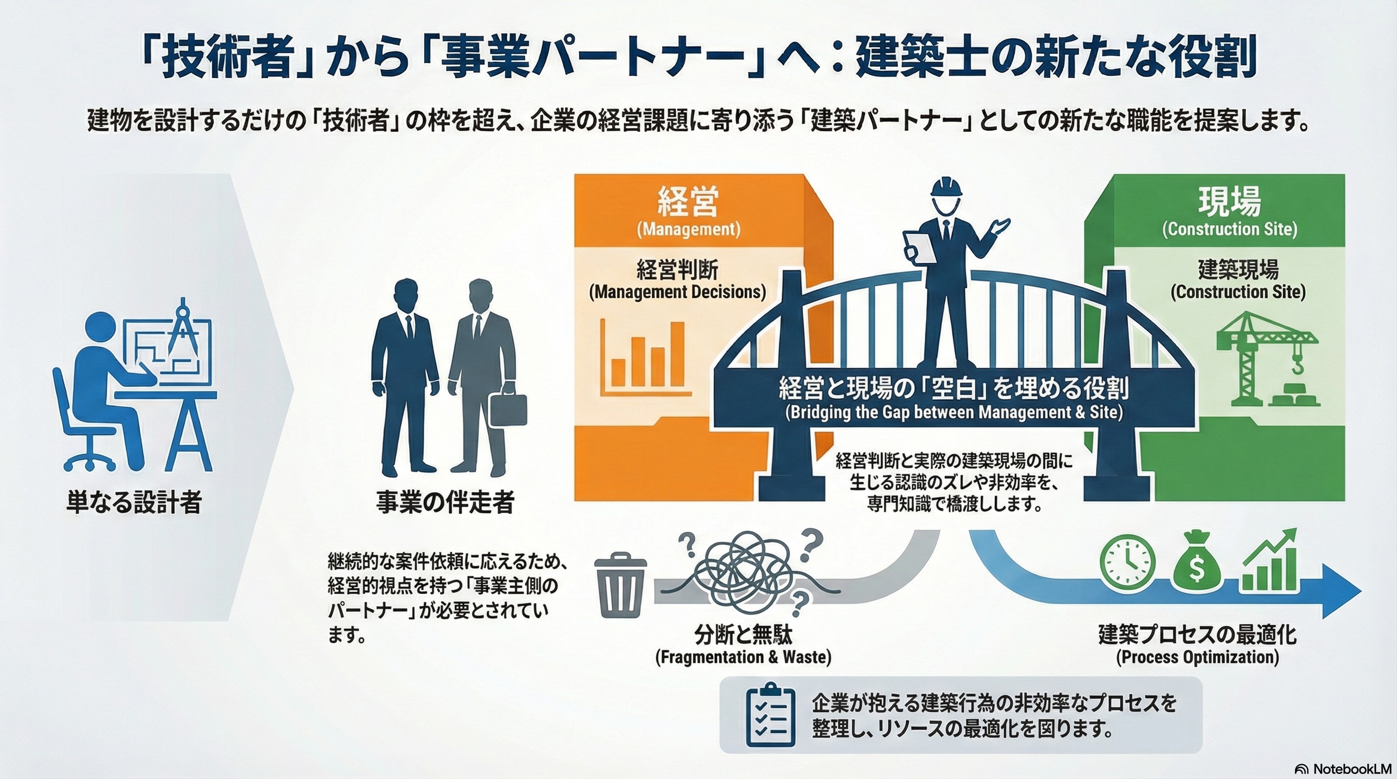 そこでは、単に建物を設計する「技術者」の枠を超え、事業の成功を共に支える「事業主側の建築パートナー」として、経営と建築現場の間に存在する空白を埋めることが必要だと感じます。