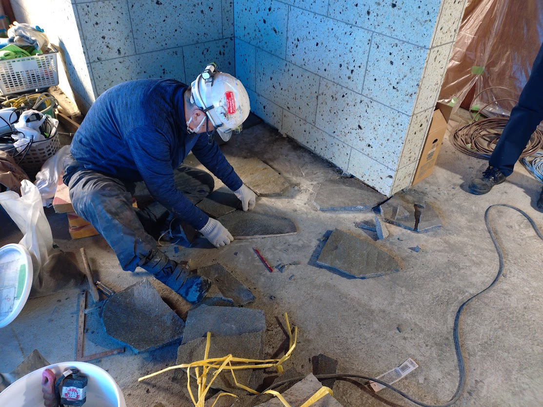 来間池ガーデンサテライトオフィスの内部石貼りの様子。
