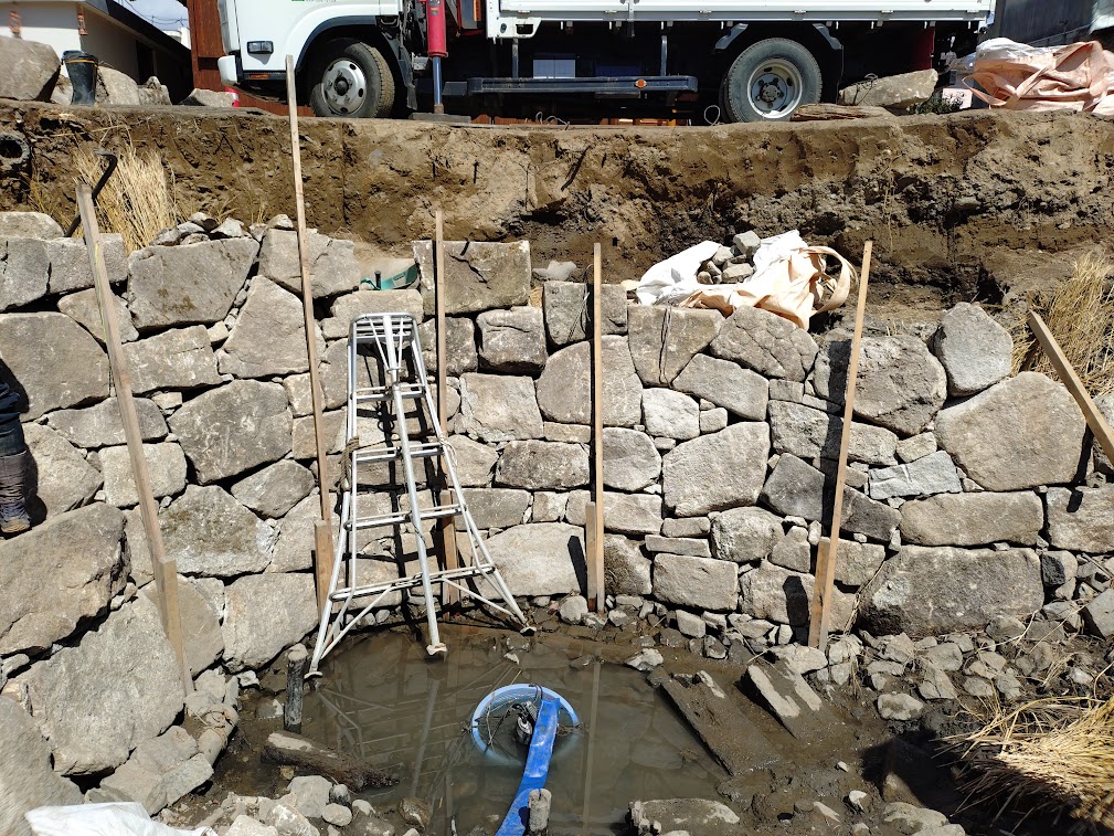 来間池ガーデンの入口は、既存のコンクリートの擁壁の間の門扉を開けると、迫力ある石墨が現れます。足元からはきれいな水が湧き出していて、小さな池になる予定。