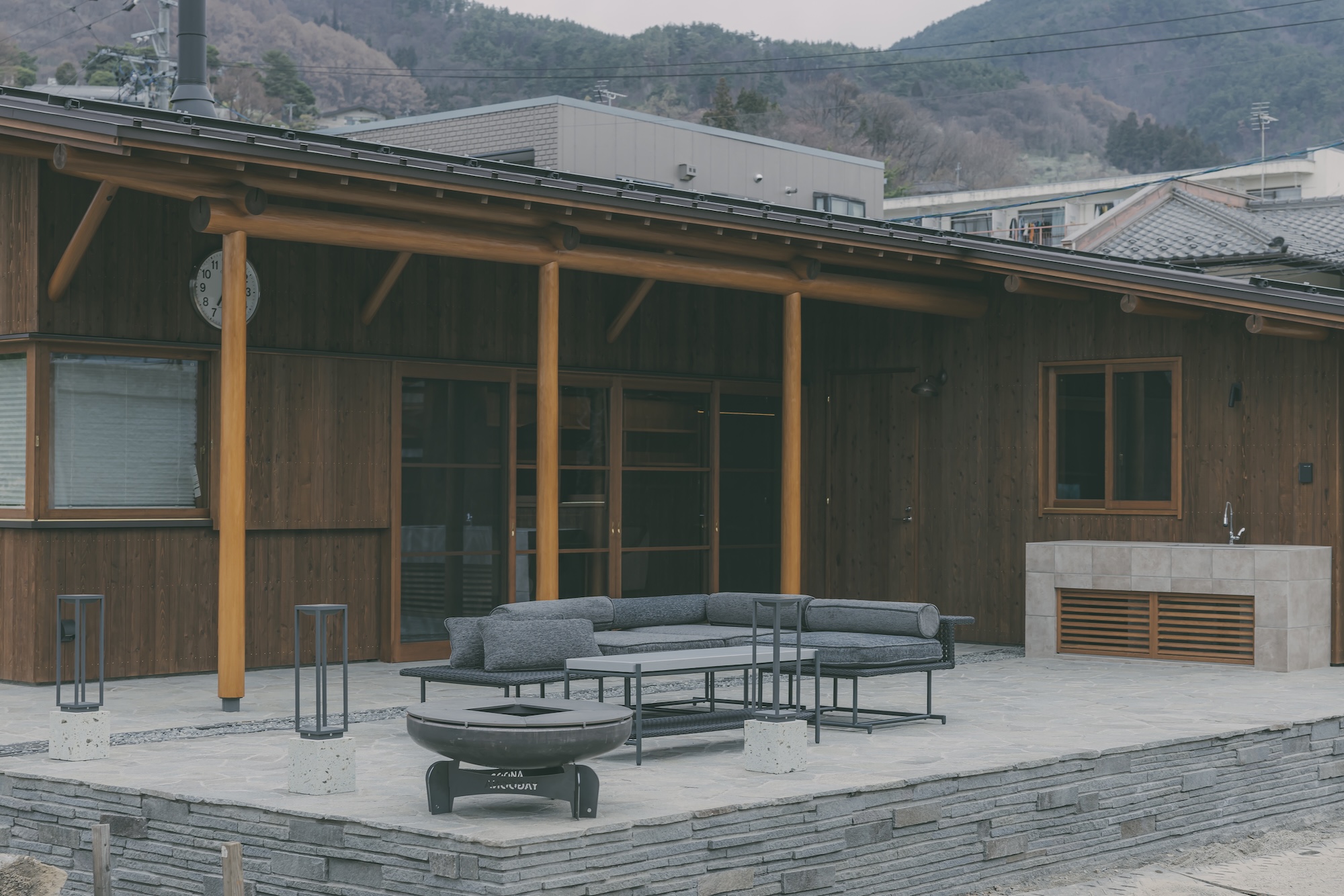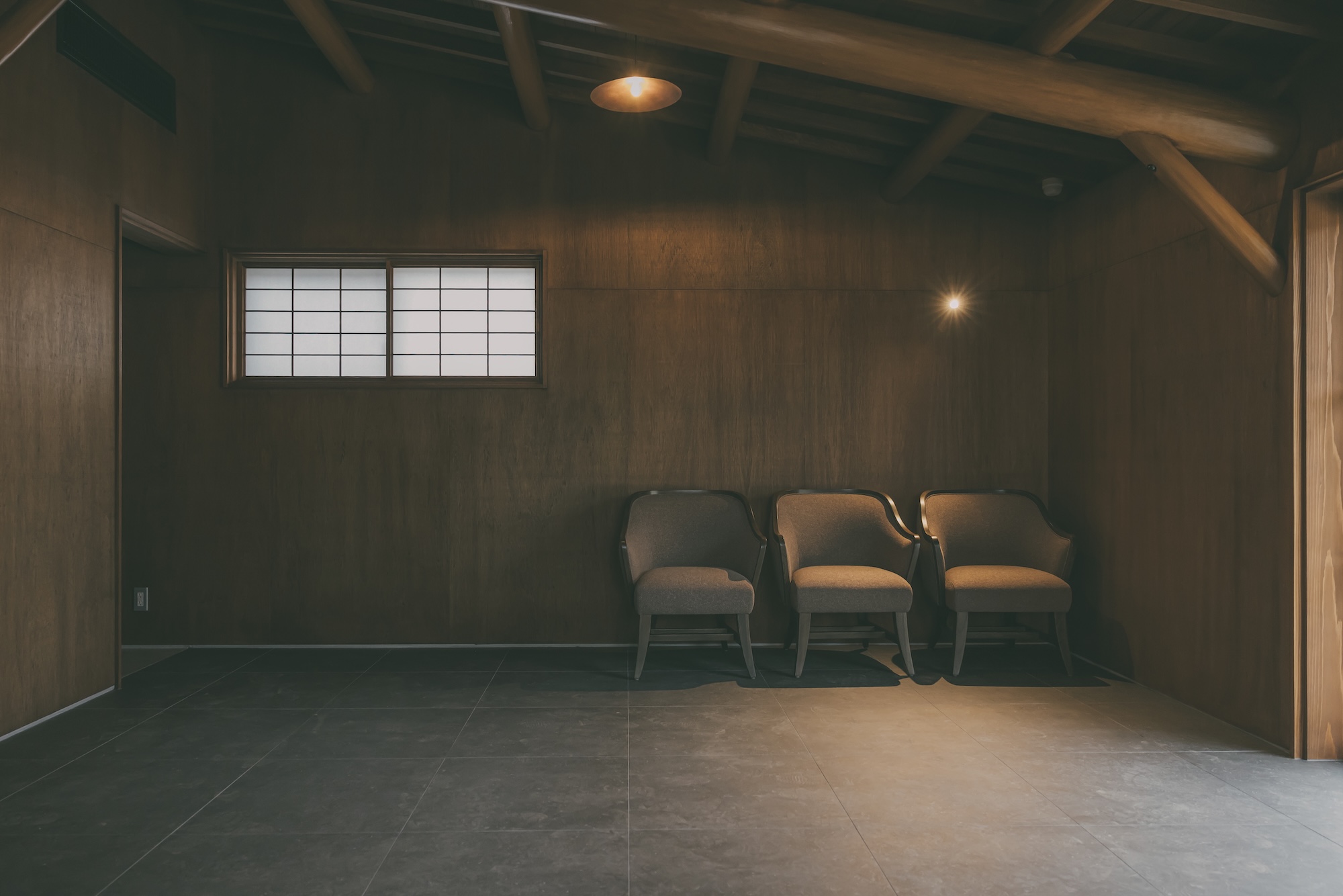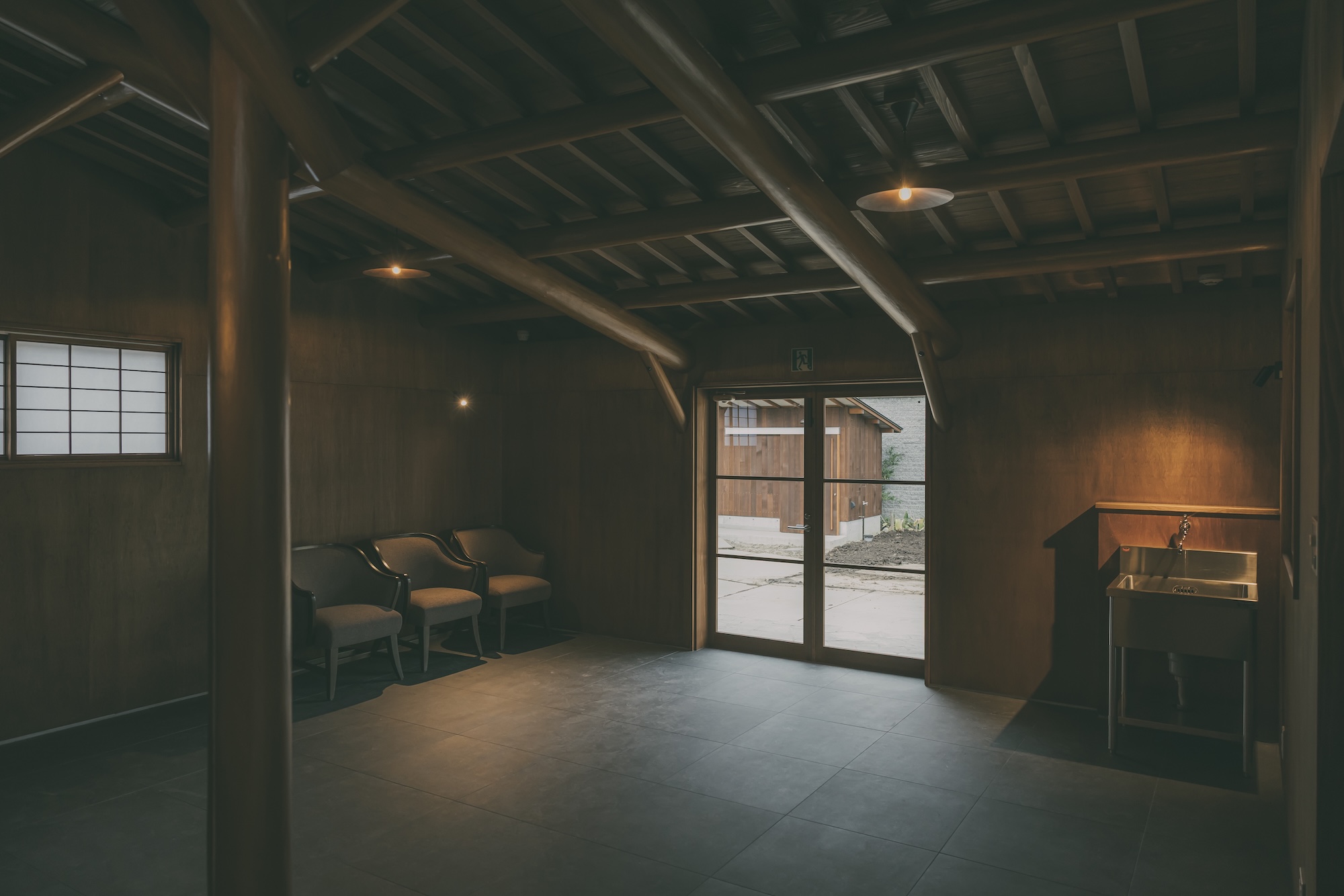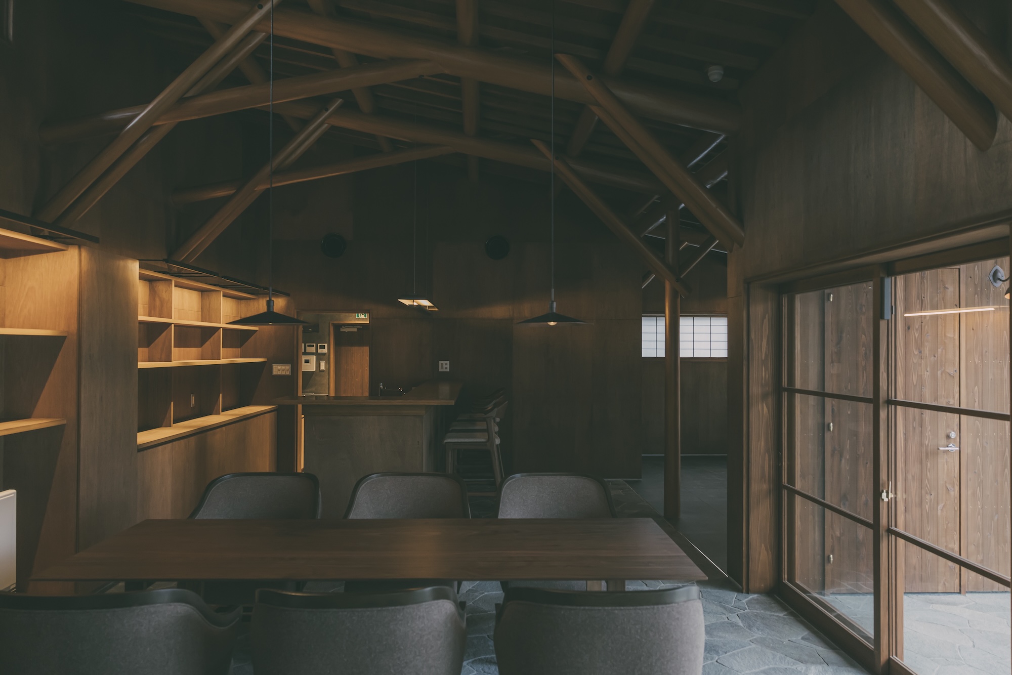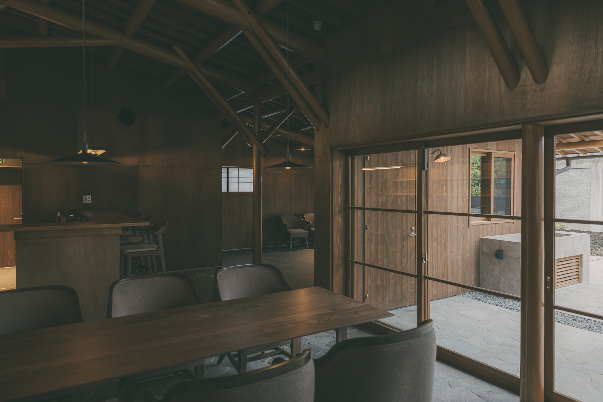 八幡屋礒五郎「来間池ガーデンプロジェクト」の一翼を担うサテライトオフィスです。 クライアントから提示された「旧井上房一郎邸(レーモンド・スタイル)」のイメージを起点に、現代に求められる機能性と、日本の伝統的な職人技術が共存する空間を目指しました。