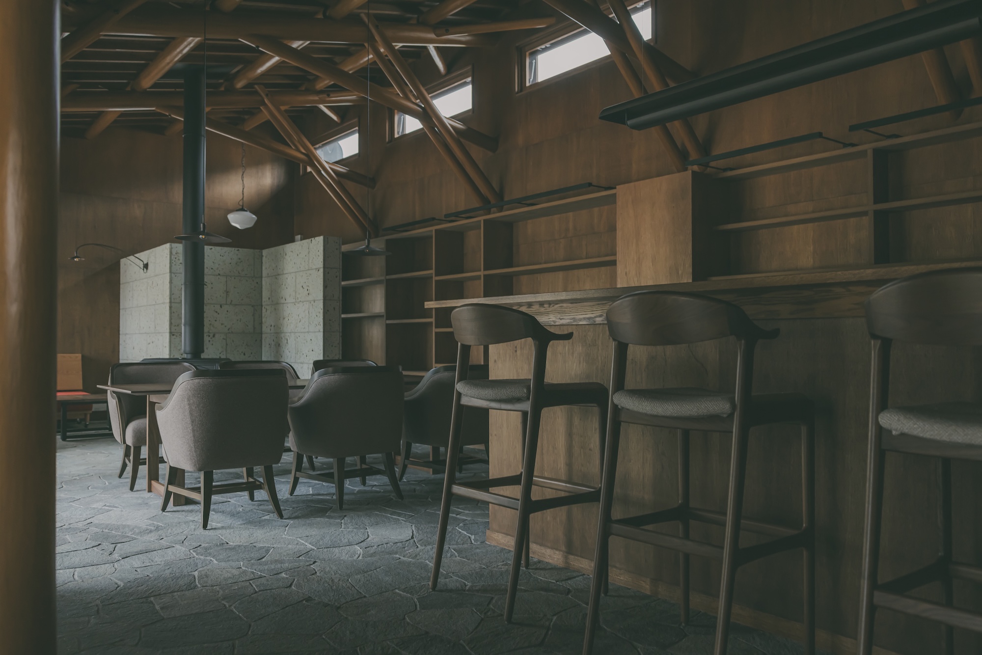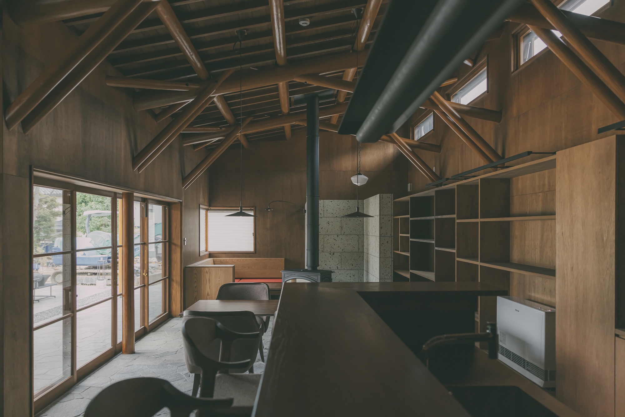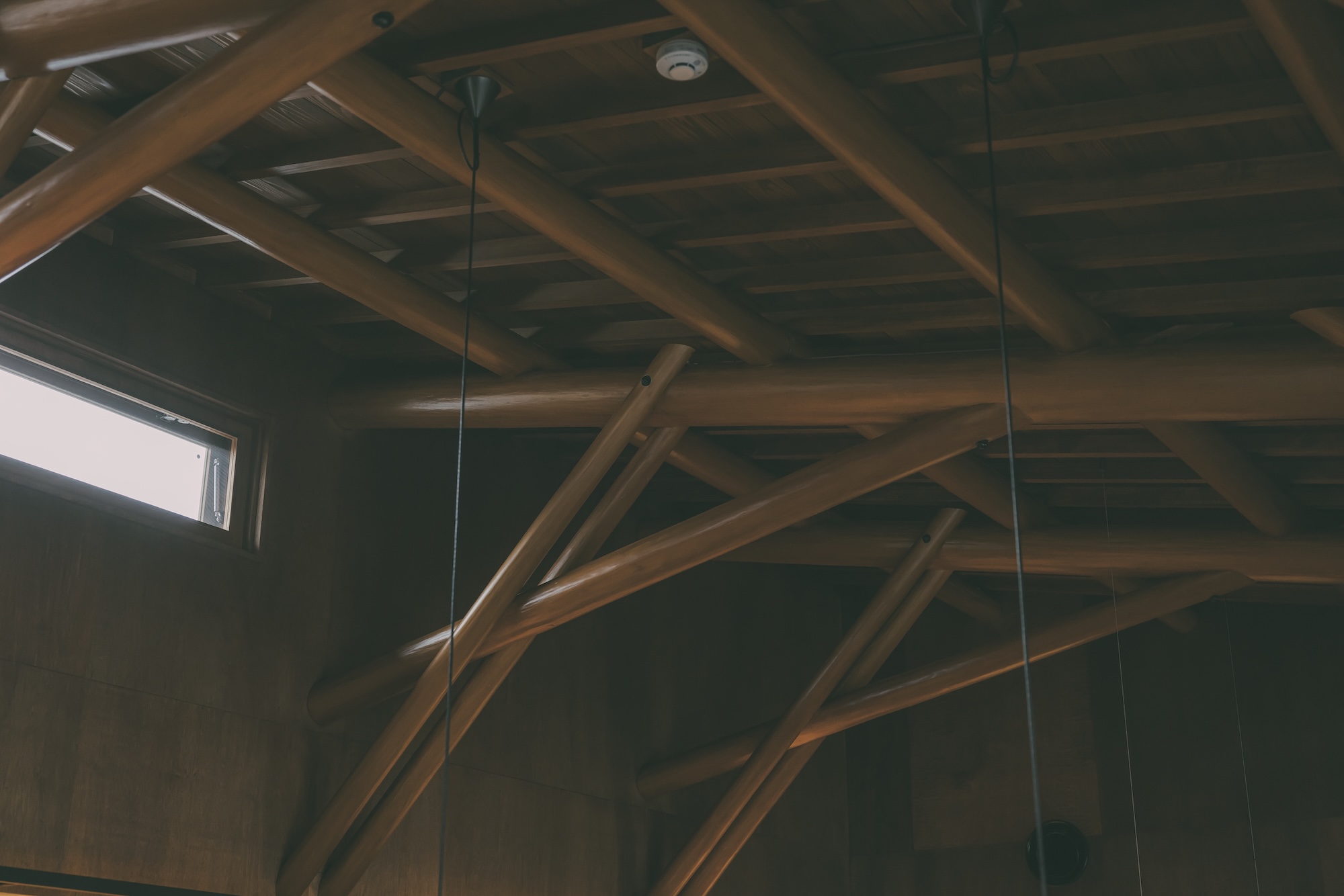 最大の特徴は、大工職人の卓越した手技によって組み上げられた磨き丸太のトラス構造です。自動プレカットでは再現不可能な、手刻みならではの複雑な接合部と有機的な造形が、空間に「優しさと力強さ」を与えています。
